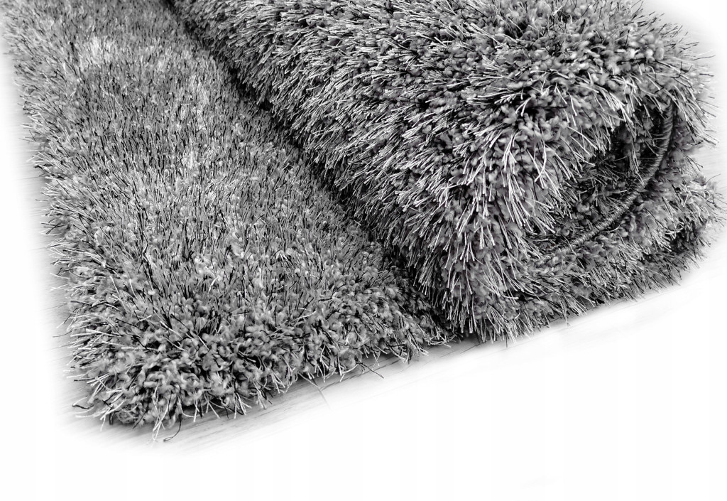 Szary poliestrowy dywan o długości włosa 5 cm z dodatkiem czarnych nici to elegancki i stylowy dodatek do wnętrza.