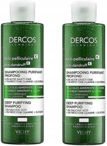Vichy Dercos K, oczyszczający szampon przeciwłupieżowy – produkt kosmetyczny z piroktonem olaminy, który pomaga chronić skórę przed rozwijaniem się na niej grzyba odpowiedzialnego na powstawanie łupieżu. Zawarty w preparacie 1,3 % kwas salicylowy wspomaga złuszczanie martwego naskórka, a także pomaga regulować ilość wydzielanego łoju. Gliceryna wspiera nawilżanie skóry głowy oraz przyciąganie i zatrzymywanie wilgoci.
