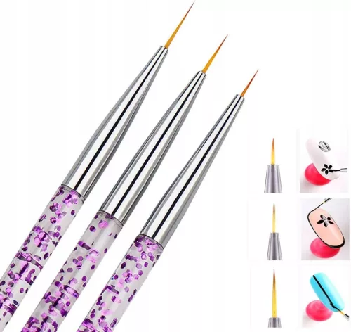 Zestaw 3 precyzyjnych pędzelków przeznaczonych do zdobień i szkicu. Wykonane z wysokiej jakości włosia nylonowego. Szczególnie polecany osobom początkującym, ale także profesjonalistom. Pozwolą precyzyjnie namalować nawet drobne wzory i cienkie linie, a także wykończyć brzegi płytki oraz ułatwią malowanie przy samych skórkach. Pędzelki posiadają piękne, brokatowe trzonki.