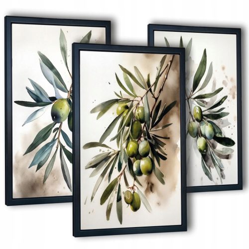 Zestaw zawiera 3 obrazy, które doskonale będą prezentowały się w kuchni bądź jadalni. Roślinne motywy gałązek oliwnych sprawdzą się w tych pomieszczeniach. Dominującymi kolorami na obrazach jest ciemna zieleń oraz odcienie brązu..