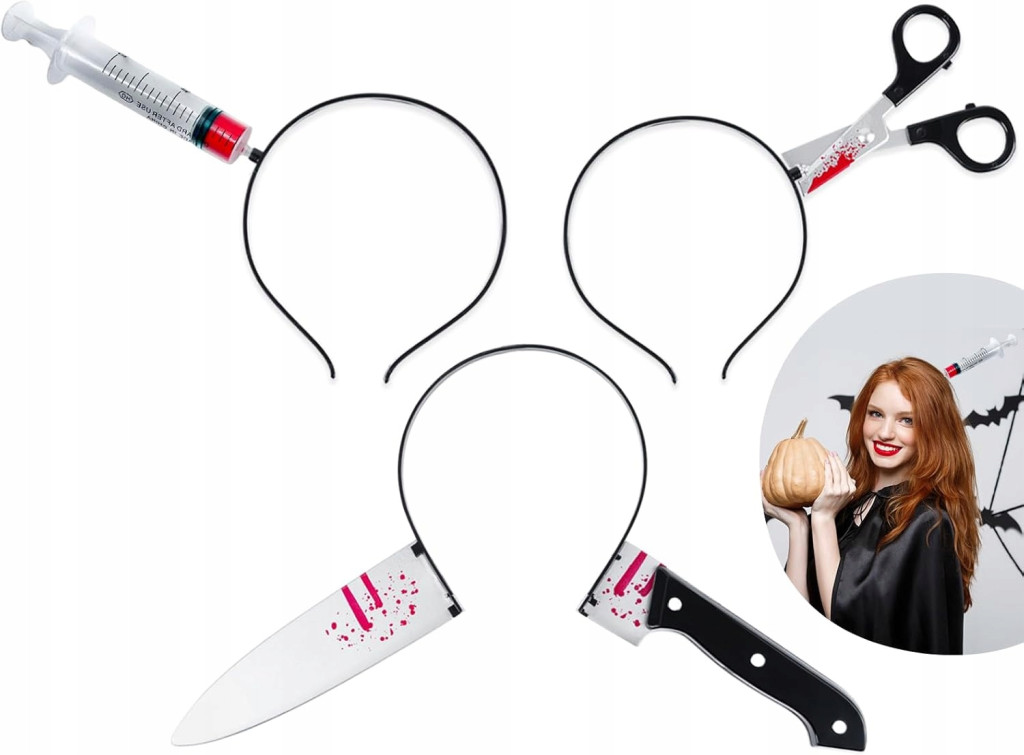 ✅ Ten zestaw Halloweenowych opasek zawiera trzy przerażające modele: opaskę z nożem, opaskę z nożycami i opaskę ze strzykawką. Idealne do tworzenia przerażającej atmosfery w Twoich przebraniach na Halloween.
