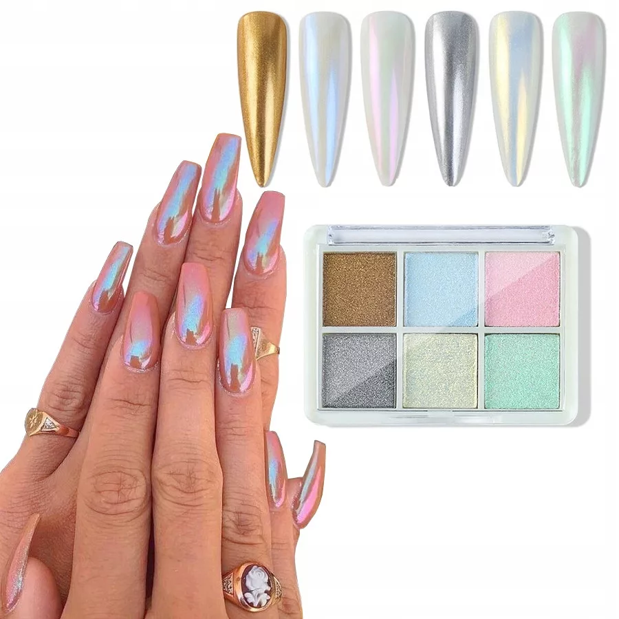 Paleta 6 perłowych pyłków do paznokci + aplikatory- efekt syrenki, tafli, muszli, lustra ⭐⭐⭐⭐⭐
