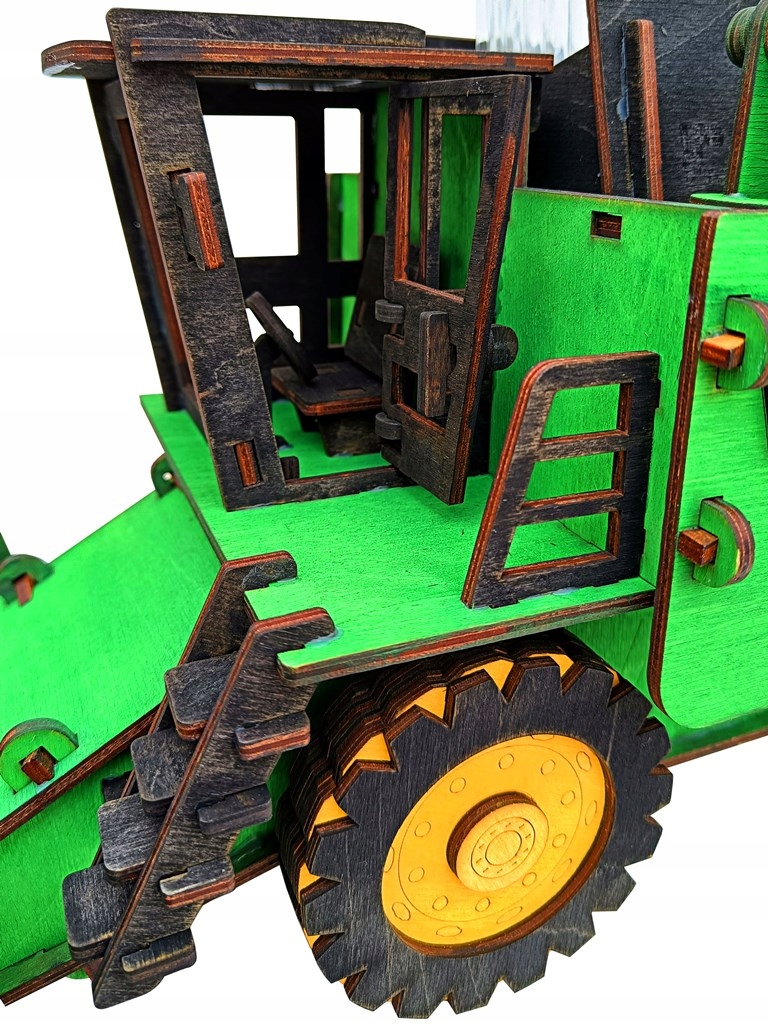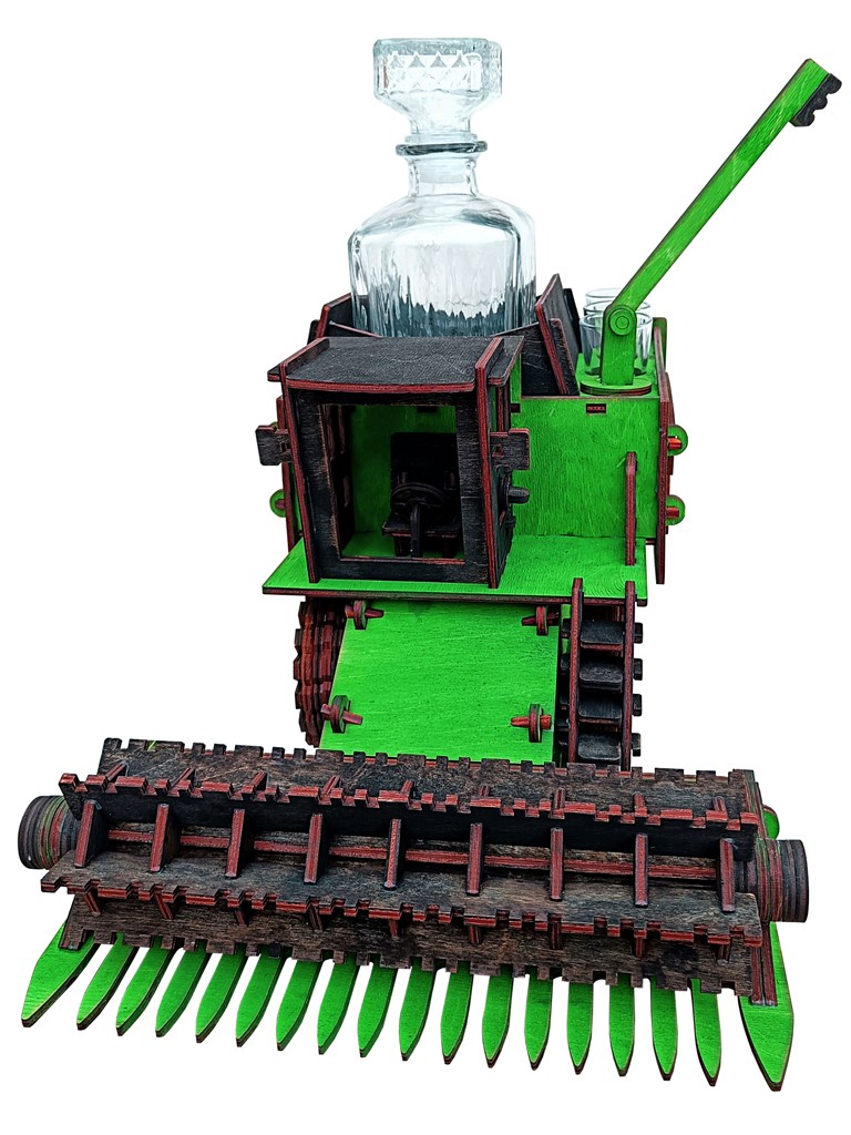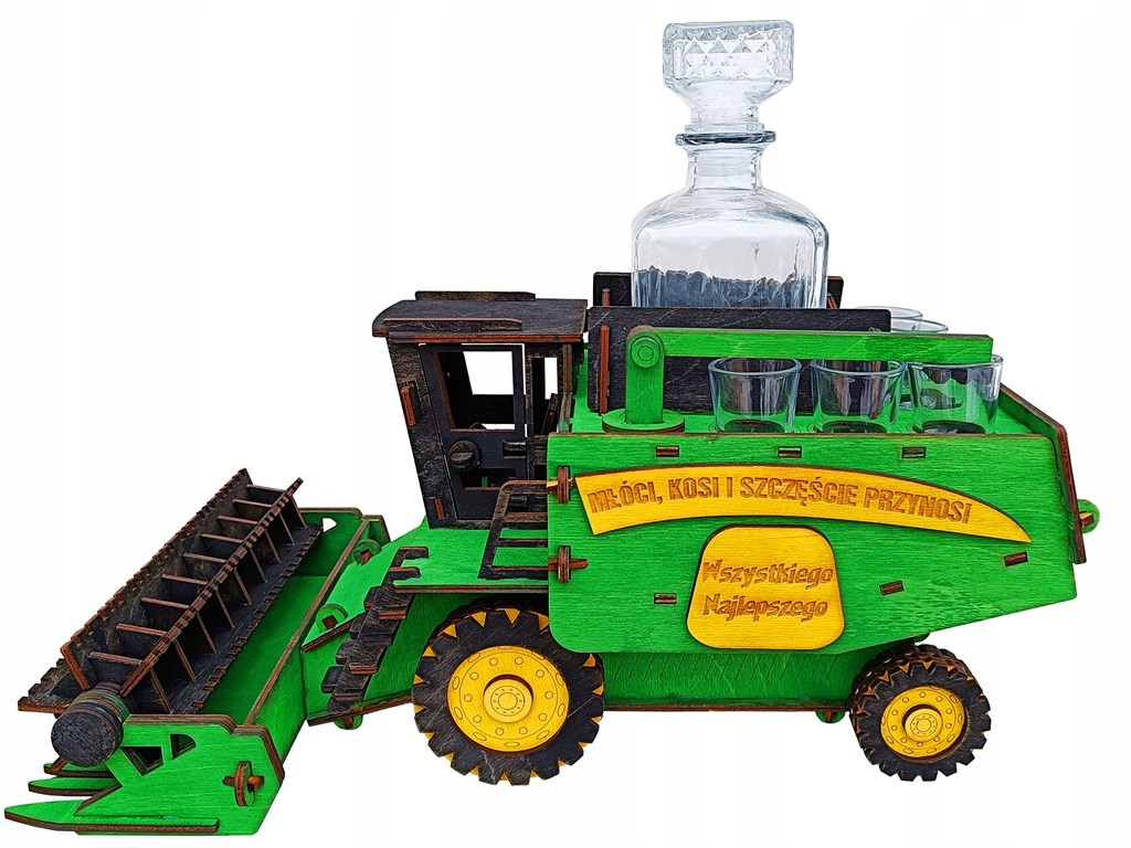 Wykonany jest z drewna, ręcznie malowany. Z przodu wyposażony jest w obrotowy nagarniacz. W zbiorniku zbożowym można umieścić karafkę lub inną butelkę z wysokoprocentowym alkoholem :) Podajnik zbożowy oraz koła są obrotowe. Posiada takie detale jak: otwierane drzwi kabiny, kierownicę oraz fotel kierowcy. Świetny i niepowtarzalny prezent na każdą okazję! Produkt zapakowany jest w przeźroczystą folię.