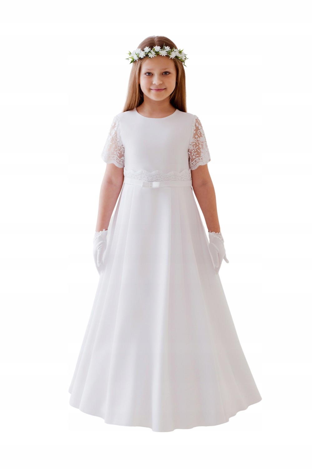 Sukienka odcinana w pasie. Rękaw i pasek wykonany z delikatnej koronki. Z tyłu kokarda. Halka z tiulem od pasa (z możliwością włożenia koła, które jest dołączone do sukienki).