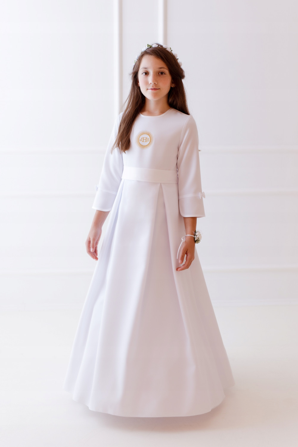 Prosta, elegancka sukienka odcinana w pasie, dół delikatne zakładki. Z tyłu pasek satynowy do wywiązania na kokardę. Halka z tiulem wszyta od pasa (z możliwością włożenia koła). Góra sukienki z wyhaftowaną hostią w kolorze srebrnym lub złotym.Tkanina stretch, pasek z satyny.