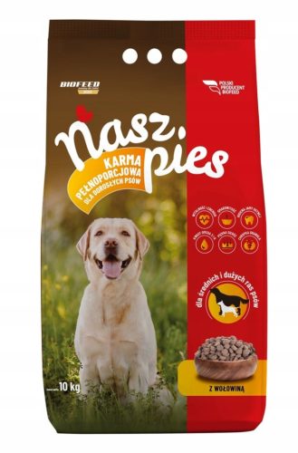 Nasz Pies to pełnoporcjowa sucha karma dla psa w wołowiną. Przeznaczona dla dorosłych psów wszystkich ras. Zawiera wszystkie składniki pokarmowe niezbędne do prawidłowego funkcjonowania organizmu psa.