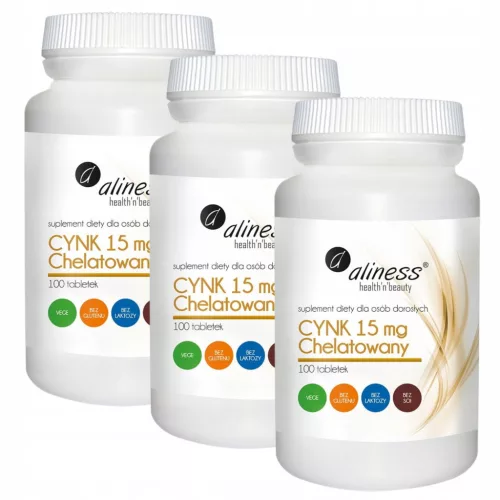 ALINESS Cynk chelatowany 15 mg to suplement przeznaczony do uzupełnienia codziennej diety w cynk i zachowania zdrowego trybu życia.