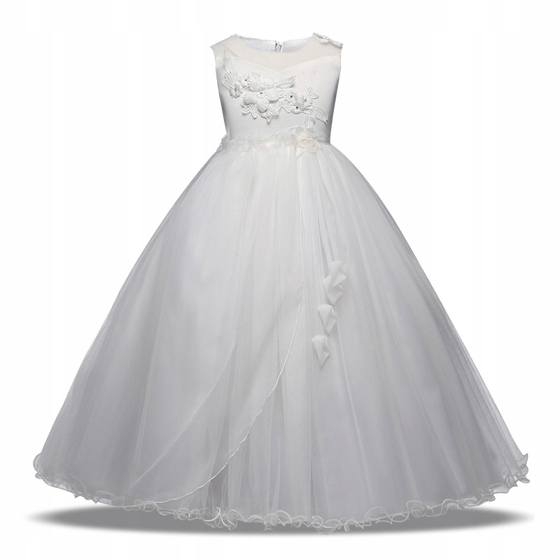 Z tyłu sukienka zapinana jest na kryty zameczek i wiązana szarfą w kokardę, aby idealnie dopasować nawet dla szczupłej dziewczynki.