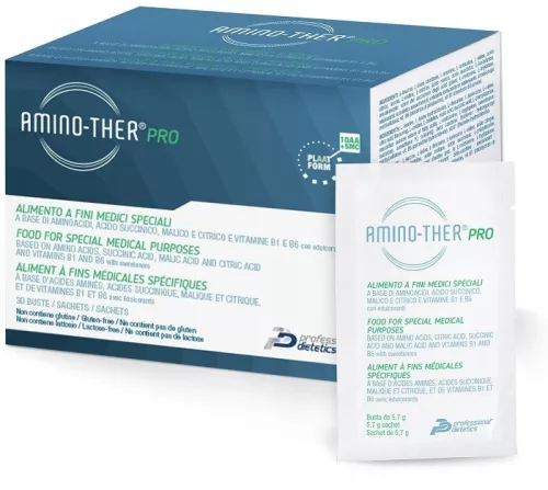 Amino-Ther® PRO to modulator mitochondriów zawierający opatentowaną kombinację 10 aminokwasów (L-leucyna, L-lizyna, L-treonina, L-izoleucyna, L-walina, L-cystyna, L-histydyna, L-fenyloalanina, L- metionina, L-tryptofan) w precyzyjnym stosunku stechiometrycznym, 3 kwasy organiczne (kwas bursztynowy, kwas jabłkowy, kwas cytrynowy) będące określonymi związkami pośrednimi cyklu Krebsa, które potrafią poprawiać odpowiedź energetyczną mitochondriów, wzbogacony witaminami B1 i B6.
