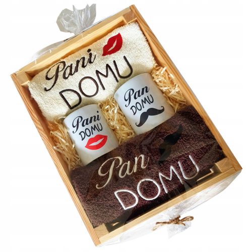 Zestaw składa się z drewnianej skrzynki, w której znajdują się 2 ręczniki z haftem oraz 2 kubki z nadrukiem. Skrzyneczka wypełniona jest wełną drzewną.Ze względu bezpieczeństwa kubki pakujemy do kartoników. Całość należy samemu spakować. Ręczniki są już zwinięte, wełna w woreczku.