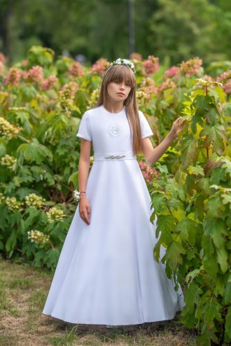 Suknia komunijna z broszką. Wysokiej klasy suknia komunijna wykonana z tkaniny liturgicznej. Sukienka podkreśla dziewczęcą urodę. Jej uroku dopełnia pasek z błyszczącą broszką. Wszyta halka oraz zastosowana fiszbina ułatwiają chodzenie oraz poprawiają wygląd spódnicy. Jedna z najpopularniejszych sukni z naszej kolekcji. Model szczególnie dobrze prezentuje się na każdej sylwetce.