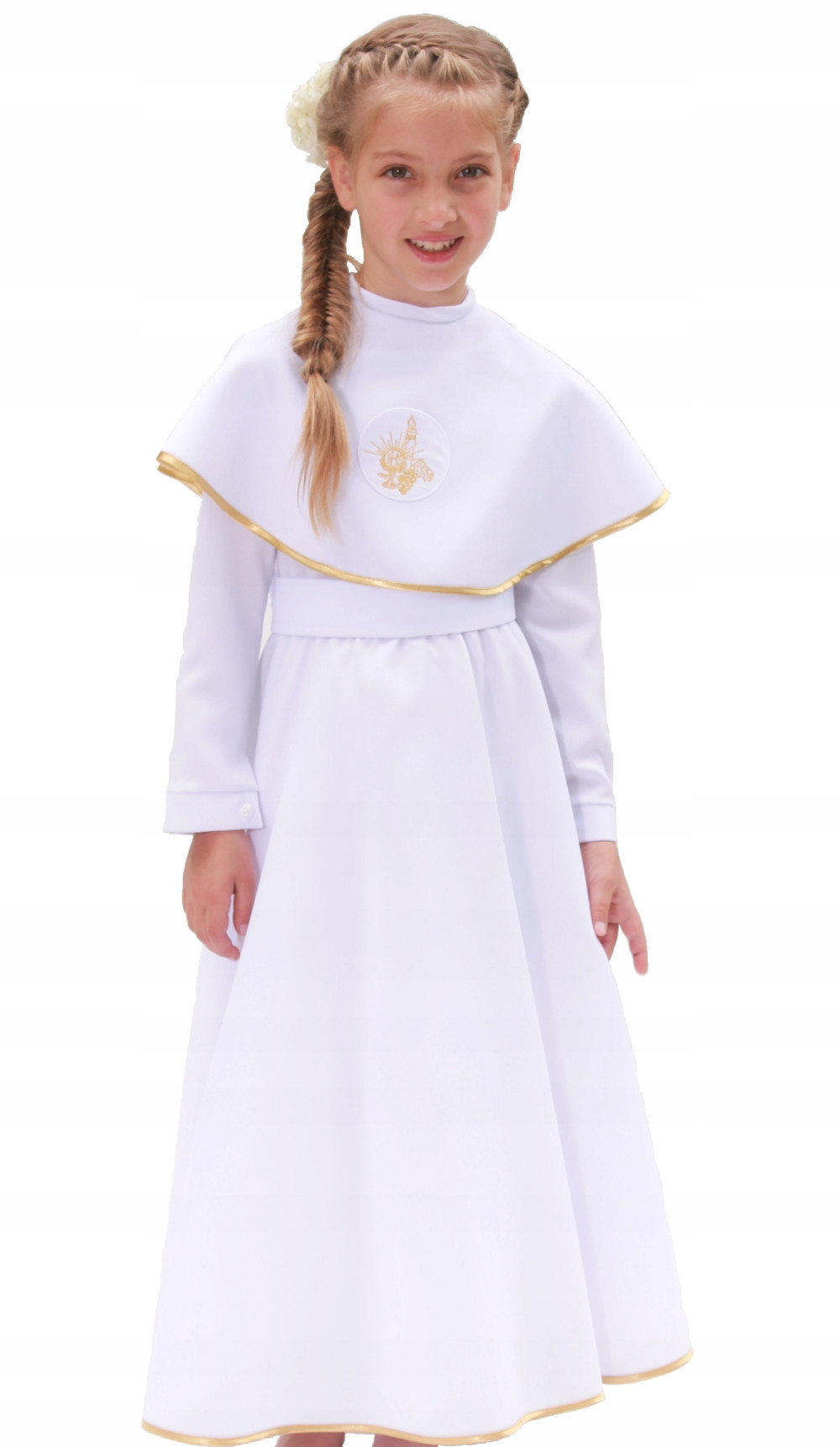 ALBA komunijna dziewczęca długa firmy SOMIR ze złotymi dodatkami w rozmiarze 146 M