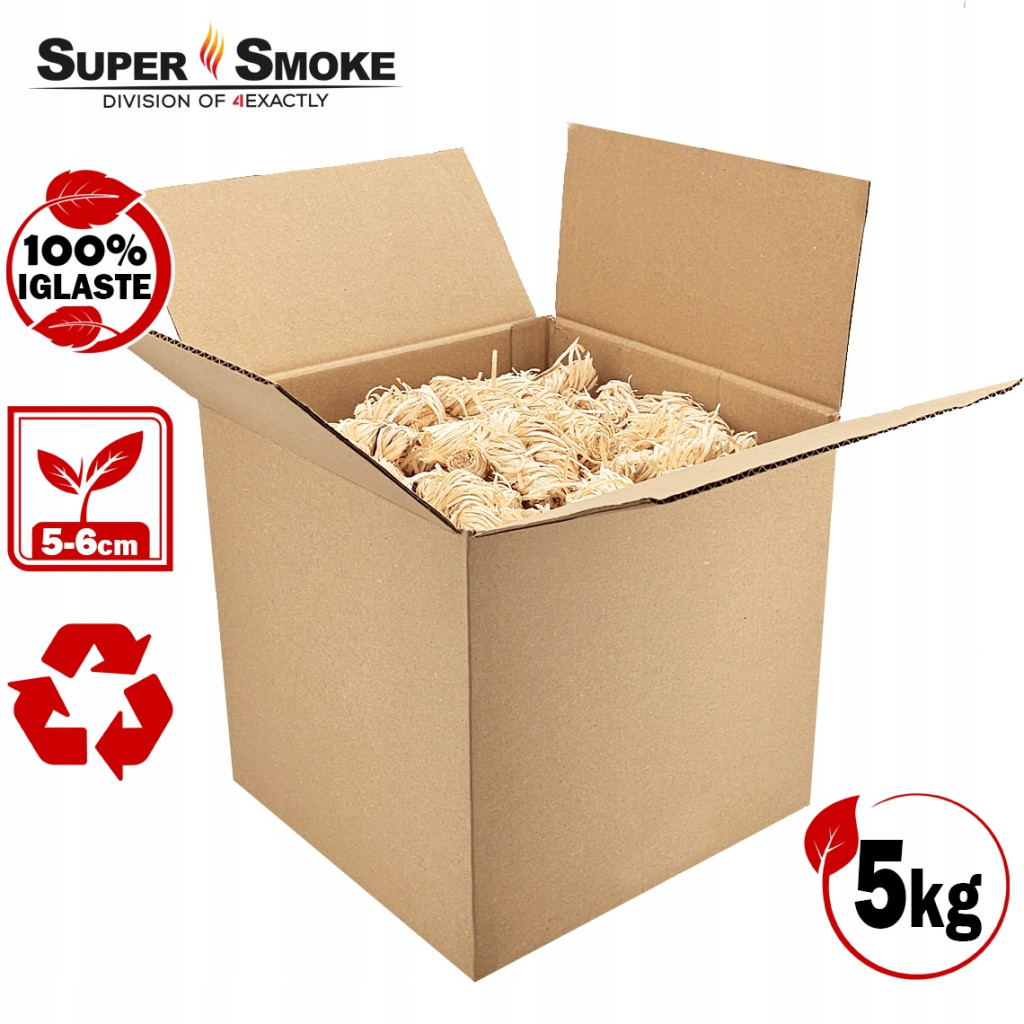 Rozpałka SuperSmoke o wadze jednostkowej 5kg. Produkt ekologiczny i w 100% biodegradowalny. Wykonane z wełny drzewnej i wosku roślinnego są w pełni naturalne i zrównoważone. Ten materiał to w zasadzie masa drobnych, miękkich wiórów drzewnych. To jeden z ostatnich produktów obróbki drewna. Uzyskuje się go za pomocą maszyny strugającej. Następnie te „wiązki” pokrywane są woskiem, aby stworzyć podpałkę. Zasadniczo wyglądają jak miniaturowe owinięte kawałki słomy.