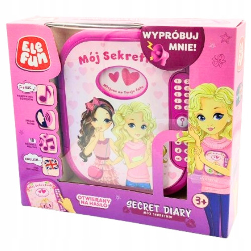 W środku znajdziesz miejsce na najcenniejsze skarby oraz książeczkę z grą językową, notes i flamaster, którym zapiszesz swoje sekrety. Sekretnik może zmienić Twój głos w nietypowy sposób. Możesz też posłuchać 10 przyjemnych melodii, ustawiając dwa poziomy głośności.