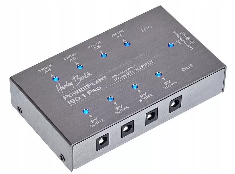 Zasilacz do efektów gitarowych Harley Benton PowerPlant ISO-1 Pro. Uniwersalny zasilacz 9V DC z 8 wyjściami zasilania odseparowanymi od siebie, skutecznie usuwa pętle mas oraz separuje zasilanie podłączonych do siebie na jednym zasilaczu efektów, dzięki temu efekty nie będą się wzajemnie zakłócały. Zasilacz składa się z 2 części, specjalnej stacji z wyjściami zasilania oraz zewnętrznego zasilacza. Małe gabaryty stacji zasilającej idealnie wpasują się do ciasnych pedalbordów. Stacja zasilająca zamknięta jest w obudowie z solidnej blachy o bardzo efektownym wyglądzie zewnętrznym.