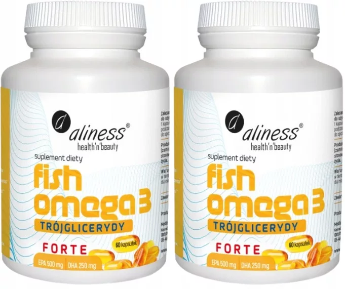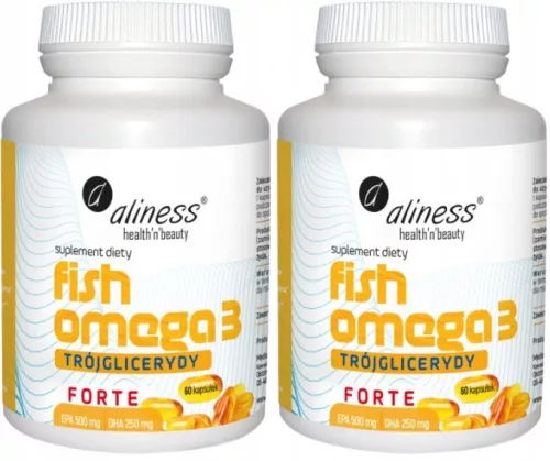 Aliness Fish Omega-3 Forte Trójglicerydy to źródło kwasów omega-3, w przystępnej formie miękkich kapsułek. Głównym składnikiem produktu jest wysokiej jakości olej rybi, który charakteryzuje się wysoką koncentracją kwasów Omega-3: EPA (kwas eikozapentaenowy) i DHA (kwas dokozaheksaenowy) w postaci trójglicerydów.
