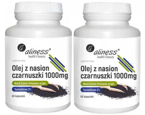 Aliness Olej z nasion czarnuszki to najwyższej jakości olej z nasion czarnuszki pochodzenia etiopskiego. Pochodzenie Etiopskie nasion gwarantuje znacznie wyższą zawartość tymochinonu w produkcie (aż 2%) niż w przypadku innych odmian oraz zachowuje wszystkie składniki odżywcze nasion. Zawiera wysoką ilość kwasu oleinowego, linolowego oraz palmitynowego.Używając wyłącznie najwyższej jakości nasion z Etiopii jesteśmy w stanie wyprodukować w 100% nierafinowany olej z czarnych nasion z pierwszego tłoczenia. Olej tłoczony jest na zimno, powolną metodą (o niskiej prędkości), która pomaga zachować składniki lotne znajdujące się w oleju i zapewnić najlepszą jakość oleju tłoczonego. Taki olej charakteryzuje się inną barwą oraz mocniejszym smakiem od pozostałych gatunków czarnuszki.