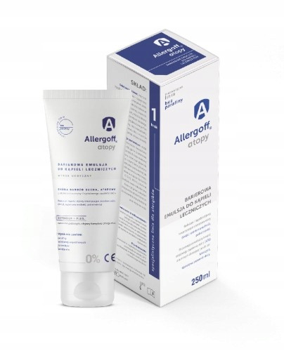 Allergoff Atopy barierowa emulsja do kąpieli leczniczych dostępna jest w opakowaniu 250 ml.