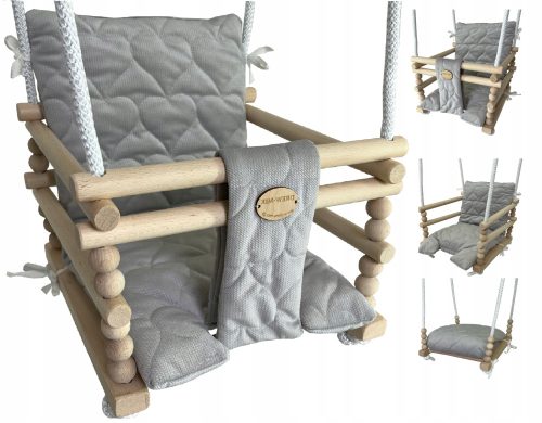 Drewniana huśtawka kubełkowa. Wykonana z certyfikowanych materiałów bezpiecznych dla dzieci. Huśtawka posiada porządnie zamontowaną przegrodę między nóżkami, oparcie oraz zabezpieczenia boczne. Wykonana jest z drewna bukowego woskowanego.