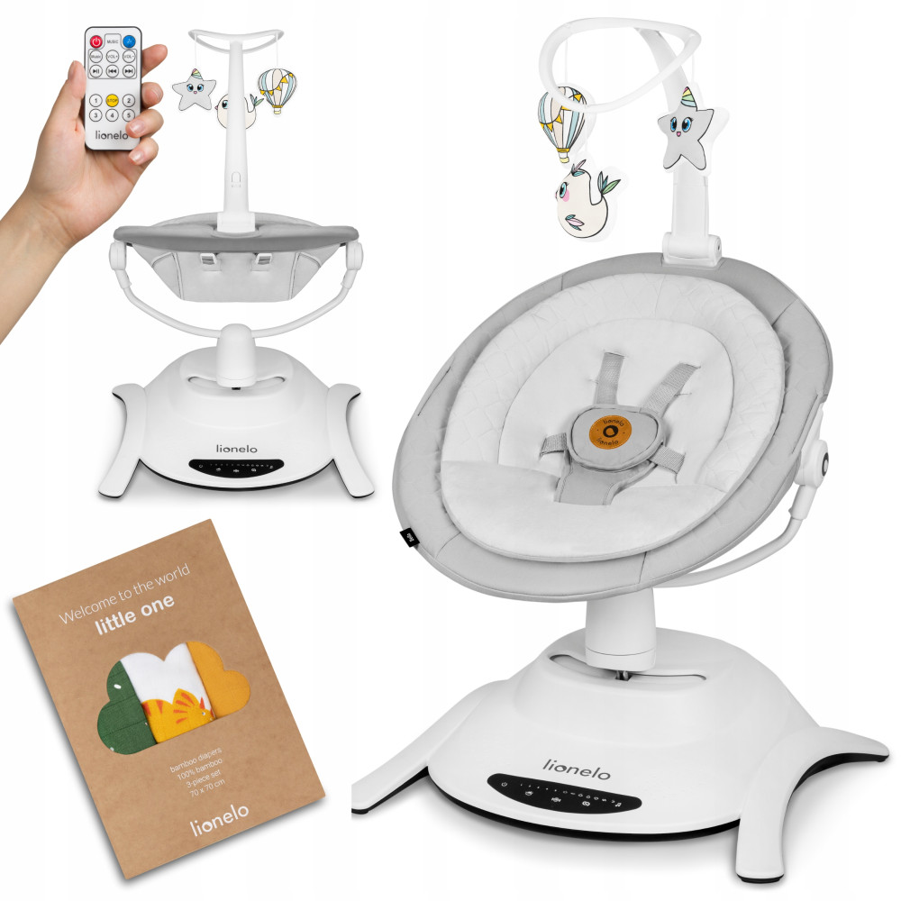 Bujaczek Lionelo Bella odtwarza 12 spokojnych melodii oraz posiada pałąk z 3 zabawkami, z możliwością regulacji (5 pozycji) i demontażu.