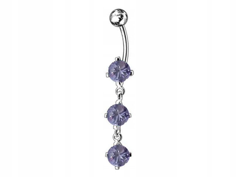 Srebrny kolczyk do pępka z fioletowymi cyrkoniami.
