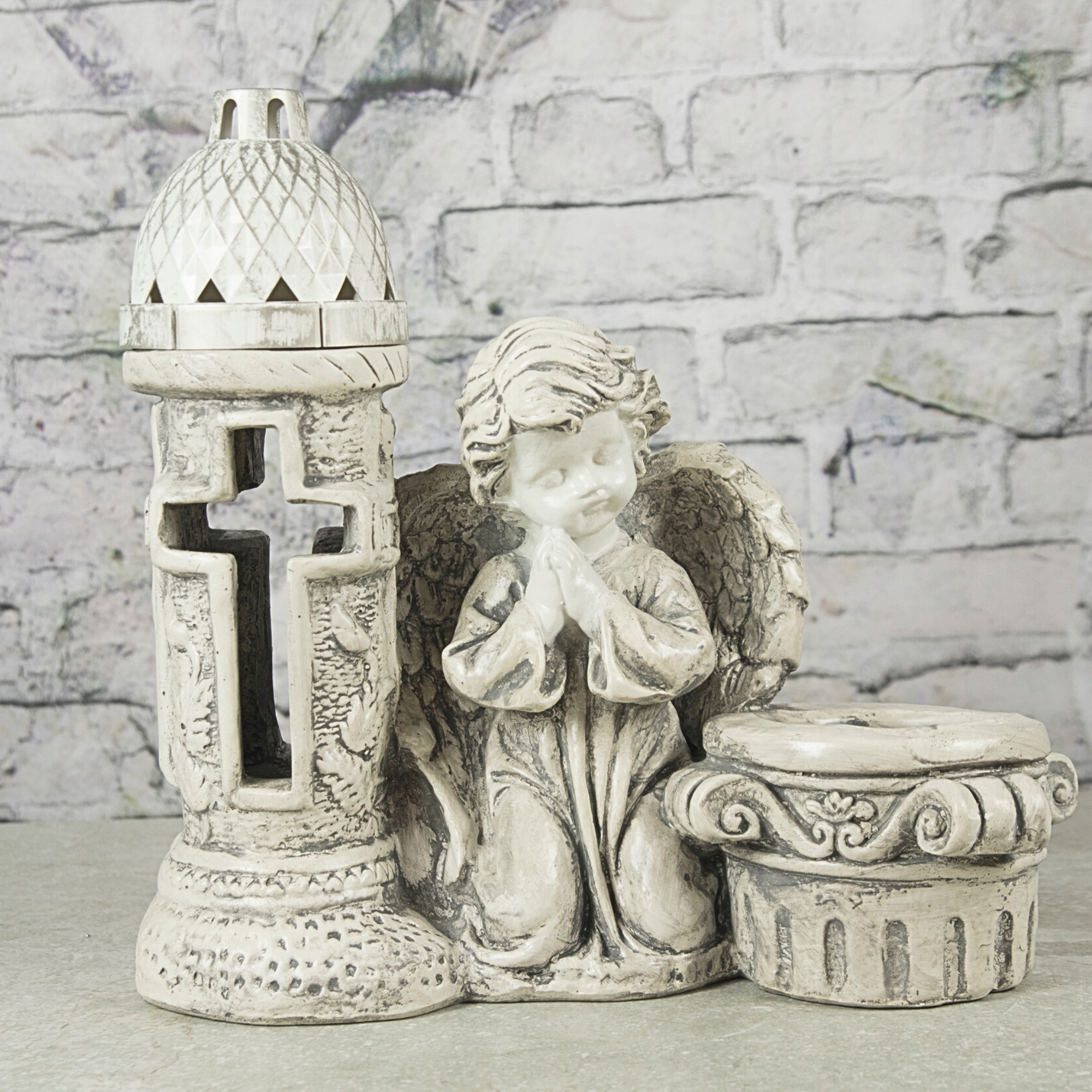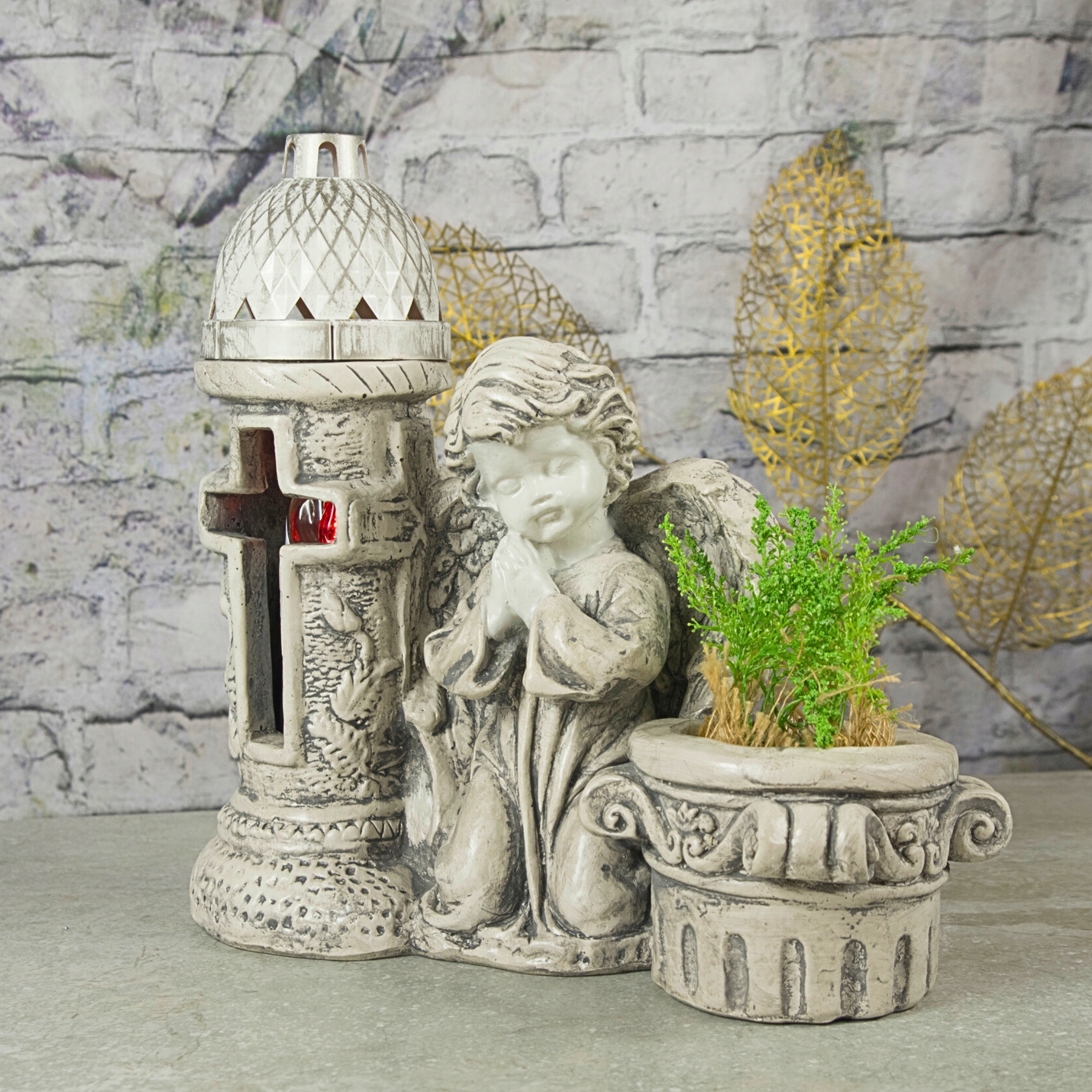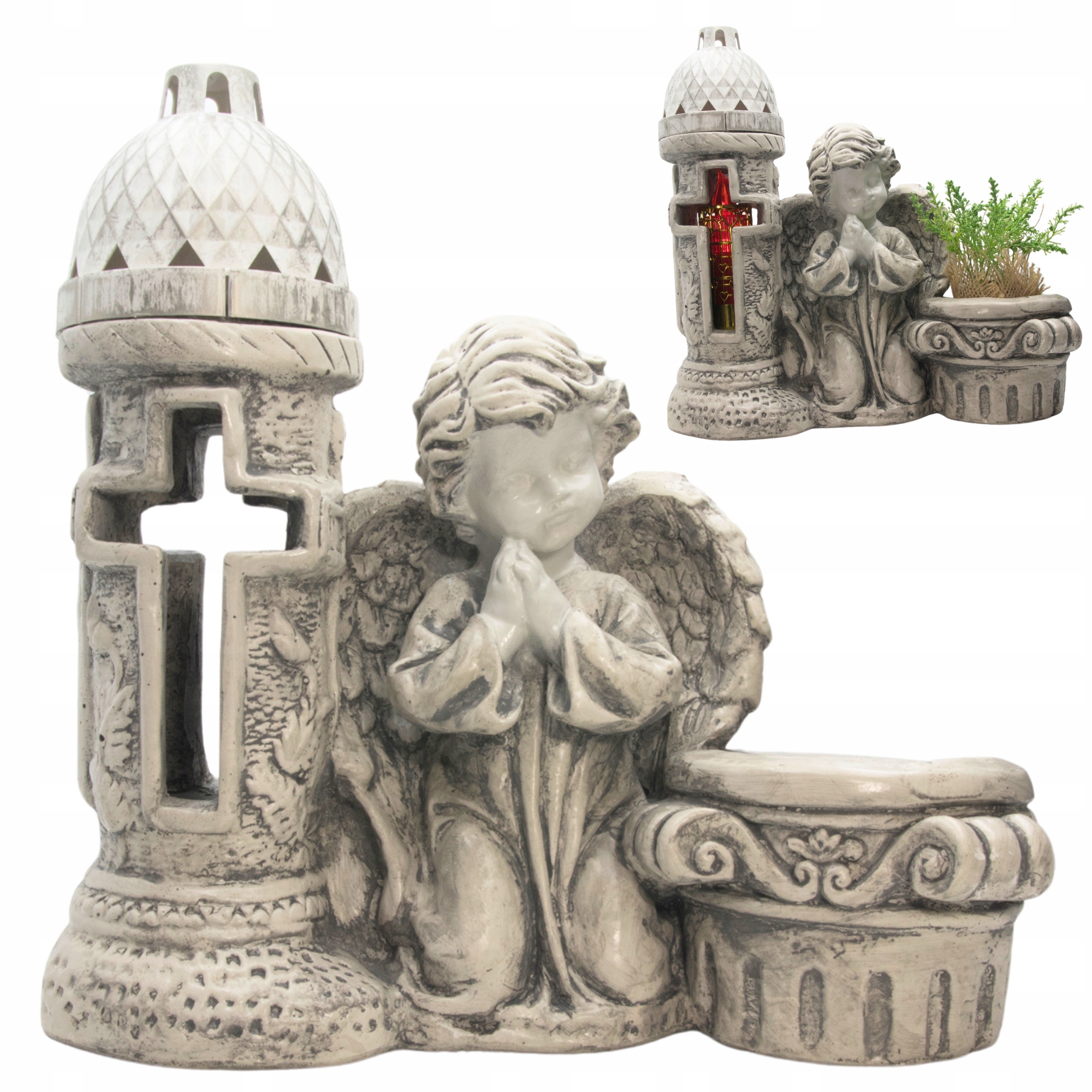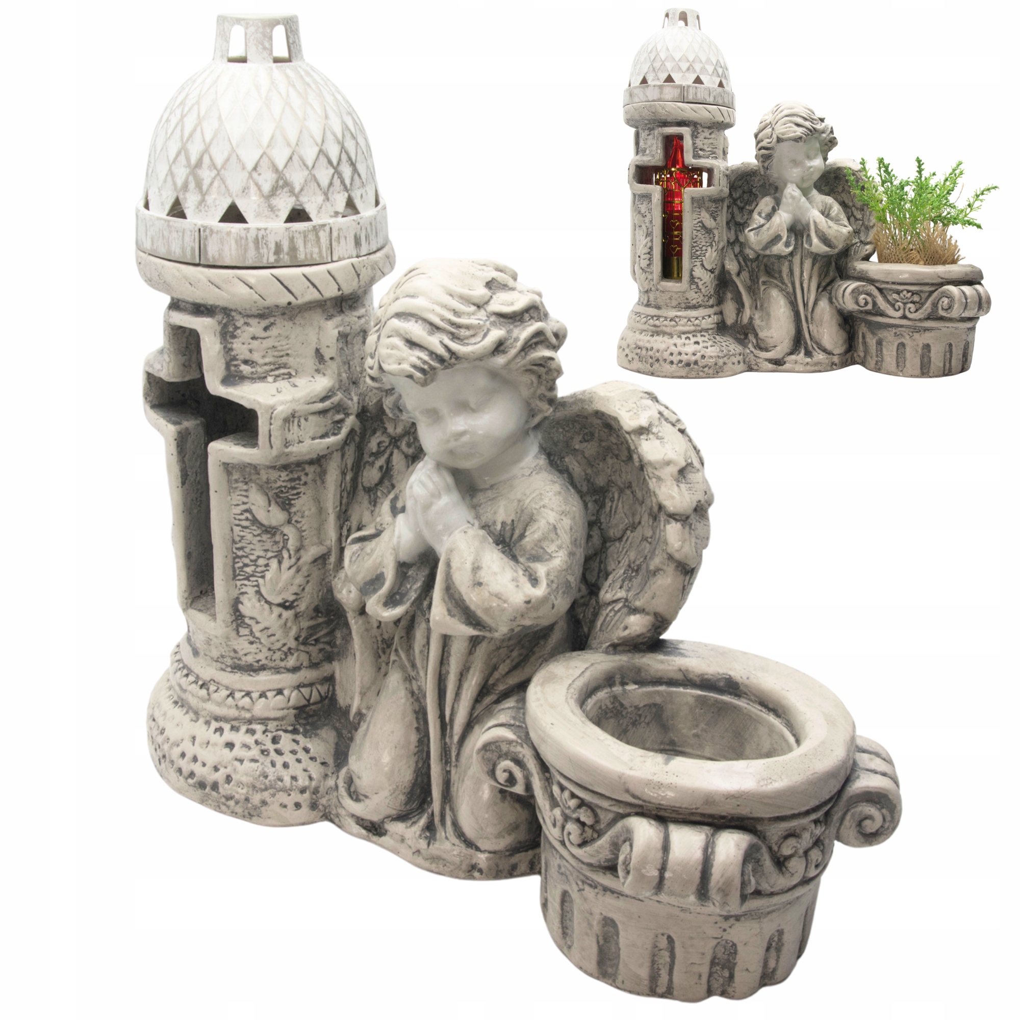 Wyjątkowa figurka przedstawiająca anioła w modlitewnej pozie, obok którego znajduje się latarnia oraz donica na kwiaty. To połączenie symboliki, elegancji i funkcjonalności sprawia, że dekoracja doskonale nadaje się do upiększenia miejsca pamięci. Wykonana z impregnowanego gipsu w kolorze antracytowym, zachwyca trwałością i dbałością o detale.