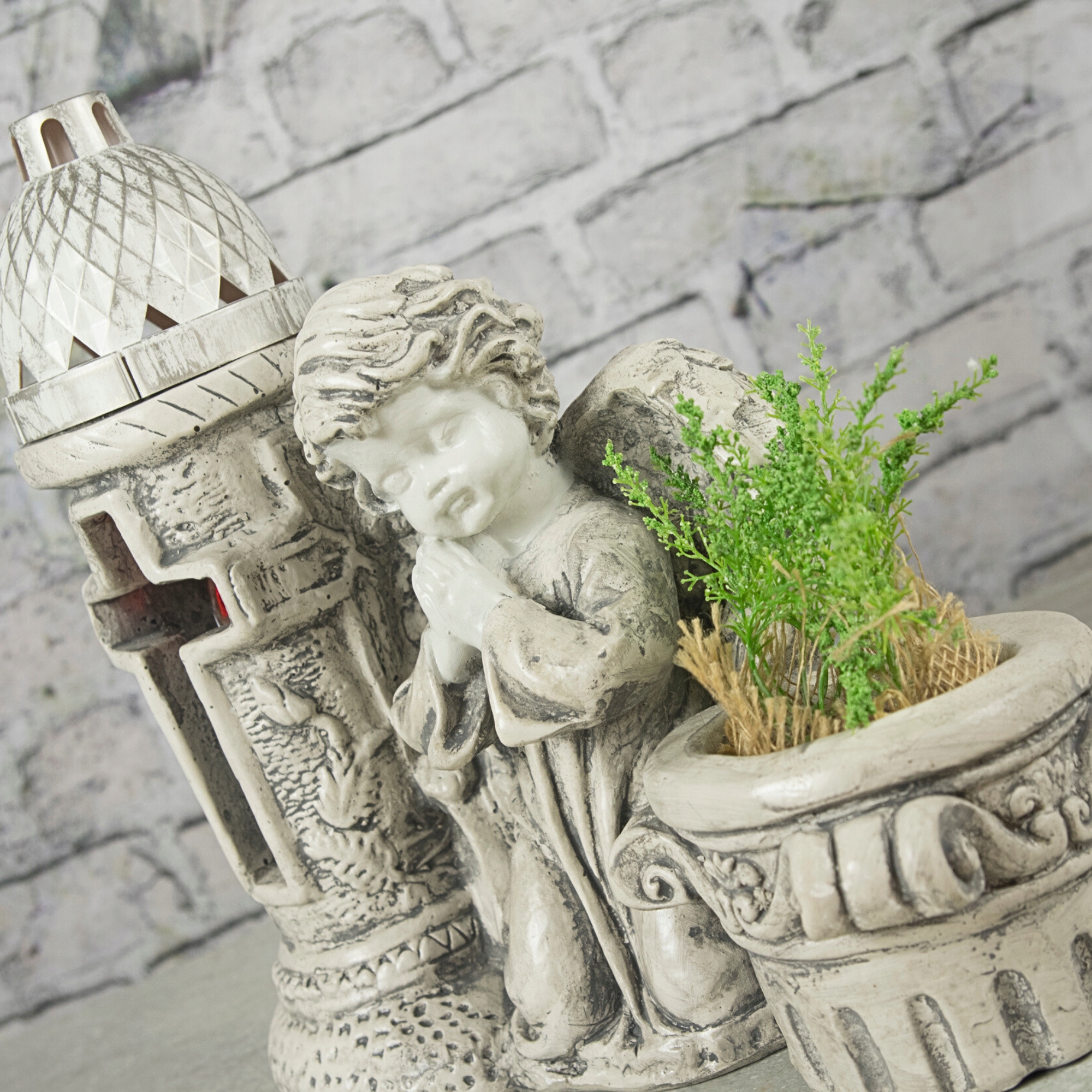 To nie tylko anioł jako symbol opieki i pamięci, ale również praktyczne rozwiązanie – w jednej dekoracji otrzymujesz latarnię na wkład oraz donicę na kwiaty. Dzięki temu możesz w prosty sposób stworzyć harmonijną i osobistą aranżację.