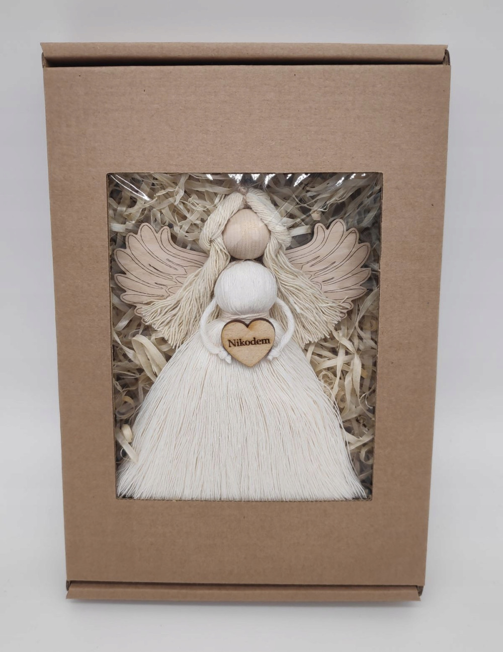 �Aniołek trzyma serduszko ze sklejki, można wygrawerować na nim imię dziecka lub osoby obdarowanej lub krótkim tekstem np. "Kocham Cię", "Anioł Stróż", "Twój Anioł Stróż". Do wyboru, ale tak by się zmieściło. Postać aniołka ma drewniane skrzydełka i jest umieszczony na wacie drzewnej w bardzo ładnym pudełku z okienkiem.