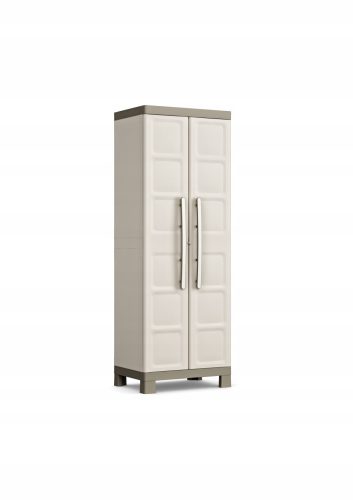 Wysoka szafa Excellence wykonana została z wysokiej jakości, niezwykle wytrzymałego i trwałego tworzywa sztucznego. Dzięki klasycznemu wzornictwu, stonowanej kolorystyce oraz kompaktowej konstrukcji model ten doskonale sprawdzi się w każdej pralni, garderobie czy garażu. Wysoka szafa Excellence wyposażona została w 4 regulowane półki - każda o maksymalnym obciążeniu do 15 kg, które można dostosować do wielkości przechowywanych przedmiotów. Wysoka szafa Excellence posiada także zamykane drzwiczki z praktycznymi schowkami i ergonomicznymi uchwytami, co gwarantuje bezpieczne przechowywanie różnego rodzaju artykułów. Dodatkowym jej atutem są podwyższone, regulowane nóżki, które ułatwiają czyszczenie podłóg.