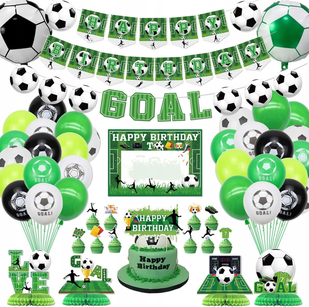 ①Piłkarskie artykuły na przyjęcie urodzinowe – w tym baner "Happy Birthday", element futbolowy, chorągiewki, elementy centralne, zawieszka z imieniem DIY, toppery na tort, balony, do dekoracji imprez piłkarskich