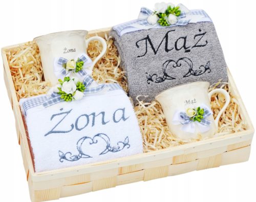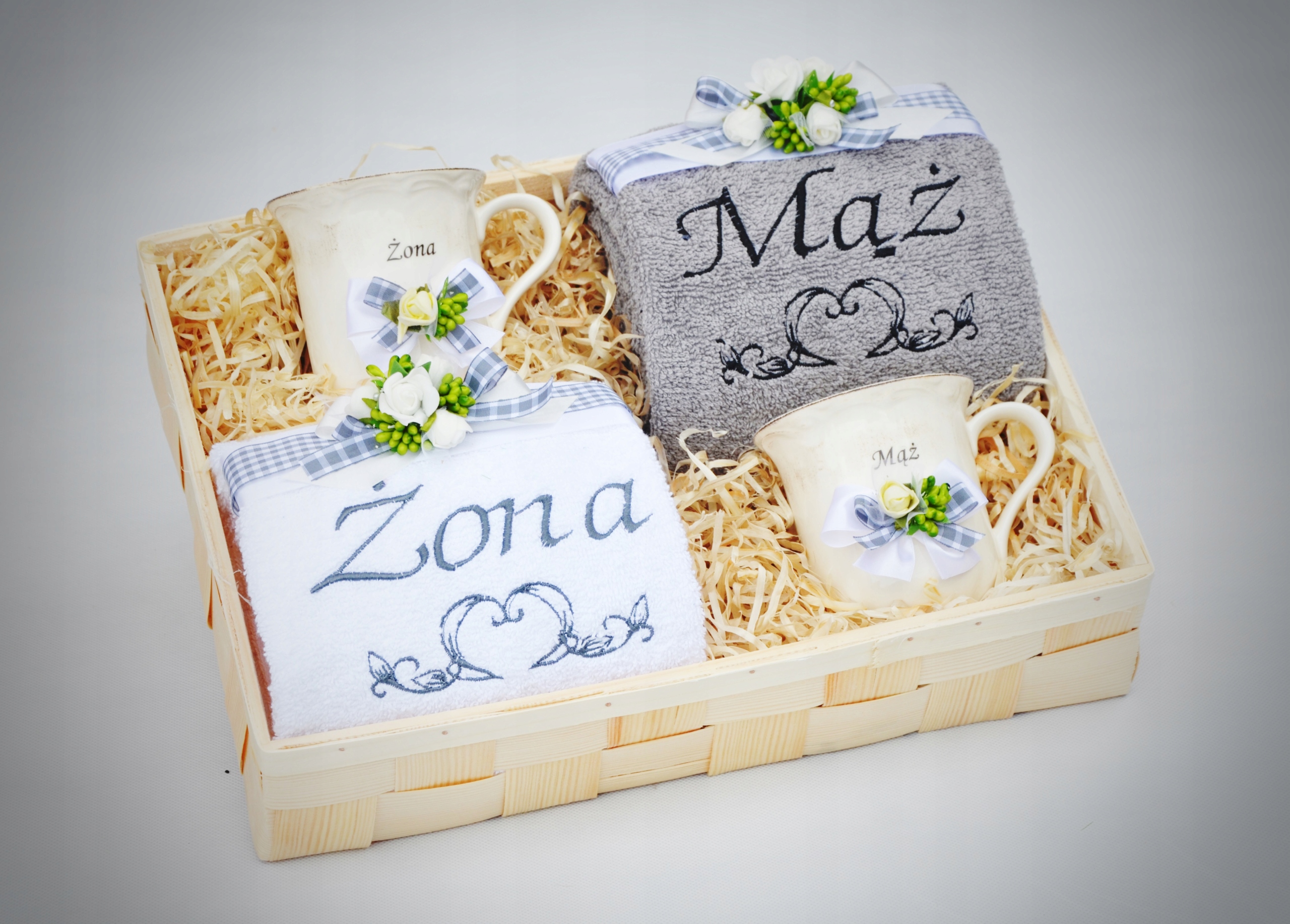 - komplet kubków porcelanowych z Manufaktury Chodzieskiej o pojemności 400 ml z ręcznie wykonanym napisem: "Żona", "Mąż" (lub filiżankami o tej samej treści) lub kubki "Najlepsza Żona", "Najlepszy Mąż"