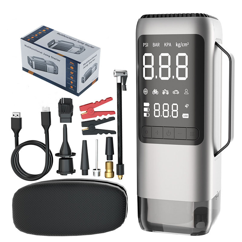 Wielofunkcyjny samochodowy zasilacz awaryjny obejmujący rozrusznik, odkurzacz, pompkę do pompowania, manometr do opon, dmuchawę powietrza, odkurzacz, power bank, latarkę LED i lampkę sygnalizacyjną SOS Beacon Light w jednym kompaktowym urządzeniu. To potężne urządzenie „dziewięć w jednym” zostało zaprojektowane tak, aby być niezawodnym towarzyszem w różnych sytuacjach, co czyni go niezbędnym narzędziem zarówno dla właścicieli samochodów, jak i podróżników. Niezależnie od tego, czy chcesz uruchomić pojazd, napompować oponę, sprawdzić ciśnienie w oponach, napompować materace, naładować urządzenia elektroniczne, rozświetlić ciemność, wezwać pomoc, czy też utrzymać samochód w czystości, to wielofunkcyjne urządzenie Ci pomoże . Jest to najlepsze rozwiązanie, które zaspokoi Twoje awaryjne potrzeby w samochodzie, zapewniając wygodę i spokój ducha, gdziekolwiek zaprowadzi Cię droga.