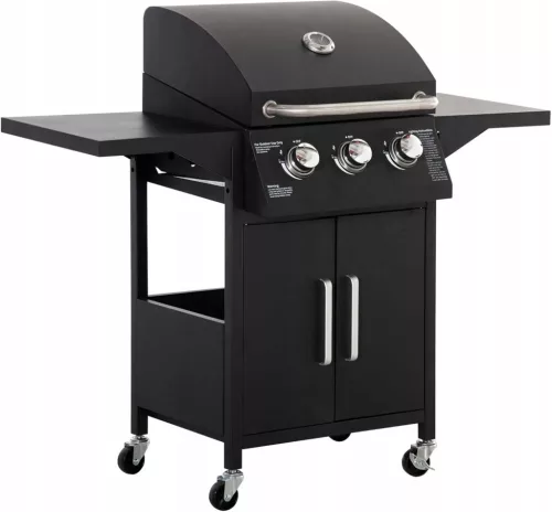Ten duży 3-palnikowy grill gazowy ma szeroką powierzchnię do grillowania z rusztem do podgrzewania. Doskonale nadaje się do grilla na zewnątrz. Każdy palnik jest wyposażony w zapłon piezoelektryczny i może być obsługiwany oddzielnie.
