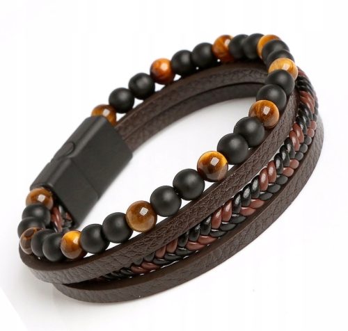 Bransoletka skórzana wykonana ze skóry i zapięciem ze stali i koralików z kamieni tygrysie oko i onyks mat
