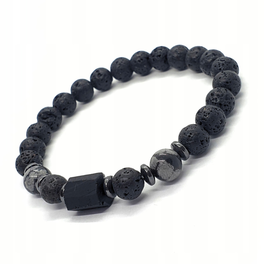 W centralnym punkcie bransoletki znajduje się czarny turmalin w postaci nieregularnej bryły. Kamień ma charakterystyczny, nieregularny kształt, a widoczne na nim ślady obróbki podkreślają jego naturalny charakter i czynią każdą bransoletkę unikatową. Delikatnie matowa powierzchnia nadaje bransoletce męskiego sznytu.