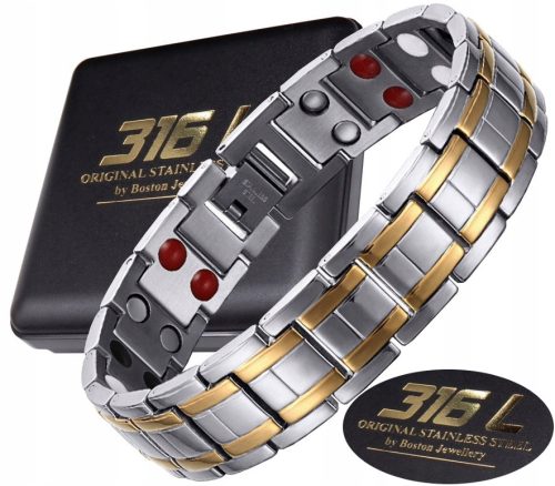 W tej ofercie prezentujemy wyjątkowo elegancki model męski bransolety magnetycznej, który wykonany jest z NAJWYŻSZEJ JAKOŚCI STALI CHIRURGICZNEJ 316L platerowanej 18k złotem. Model ten wyróżnia bardzo eleganckie połączenie elementów złotych i srebrnych. Taki układ bardzo efektownie się prezentuje na dłoni i robi niesamowite wrażenie !!! Jest to jeden z najciekawszych i najlepiej sprzedających się modeli w ostatnim czasie !