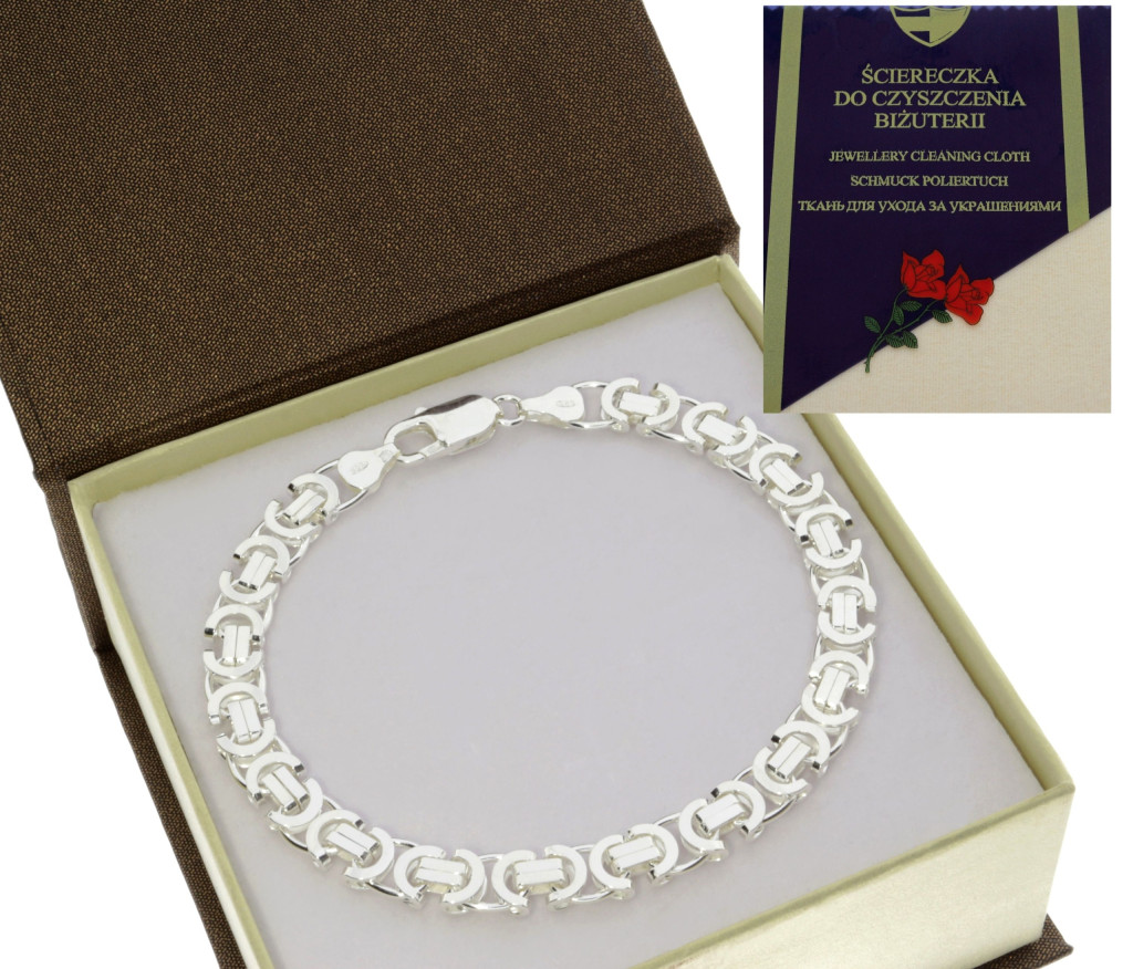 Bransoleta wykonana jest ze srebra próby 925. Zgodnie z Polskim prawem każdy wyrób w którym waga przekracza 5 gramów przebadany i ocechowany jest przez Państwowy Urząd Probierczy. Produkt ,który otrzymasz będzie w 100% zgodny z opisem.
