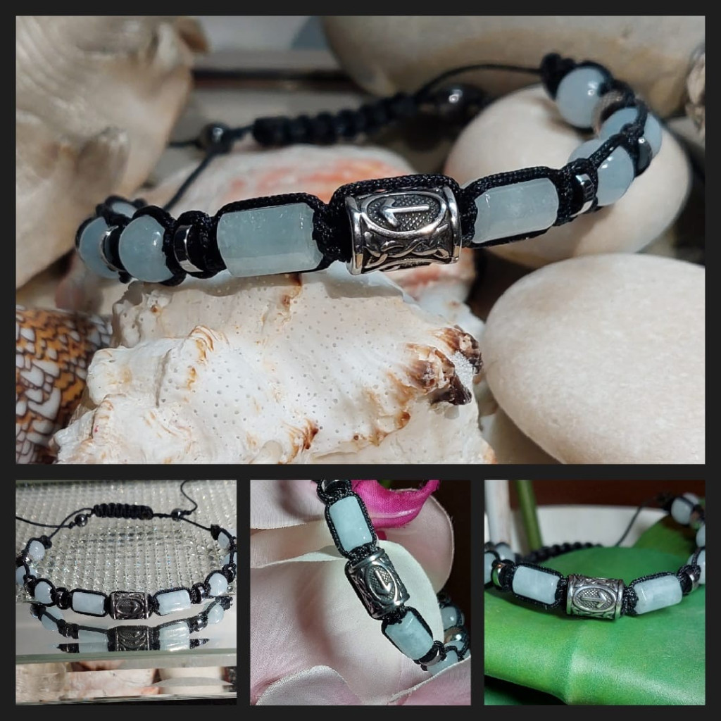 Akwamarynu i przekładek Hematytu w kolorze srebra z ozdobnymi koralikami w kształcie bieżnika ze stali chirurgicznej i runy Wikingów Teiwaz.