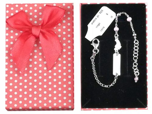 Srebrna dziecięca bransoletka z blaszką i motywem stópki + różowe koraliki , wykonana jest ze srebra próby 925. Bransoletka jest polerowana dzięki czemu uzyskuje wysoki połysk, wykonana jest ze srebra próby 925, bransoletka jest rodowana co zabezpiecza przed czernieniem, nadaje większy połysk, przypomina białe złoto lub platynęNa blaszce jest możliwość wykonania 2 stronnego grawerunku gratis, (blaszka - ok.10 znaków na stronę.- ilość znaków orientacyjna - im jest ich więcej tym grawer staje się mniejszy ), preferowane czcionki jednoliniowe nr. 3,6,11. - czytelniejsze przy małych grawerunkach