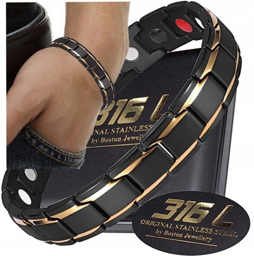 W tej ofercie prezentujemy wyjątkowo elegancki model męski bransolety magnetycznej, który wykonany jest z NAJWYŻSZEJ JAKOŚCI STALI CHIRURGICZNEJ 316L anodowanej na czarno i platerowanej 18K złotem. Model ten wyróżnia bardzo eleganckie połączenie elementów złotych i srebrnych. Taki układ bardzo efektownie się prezentuje na dłoni i robi niesamowite wrażenie !!! Jest to jeden z najciekawszych i najlepiej sprzedających się modeli w ostatnim czasie !
