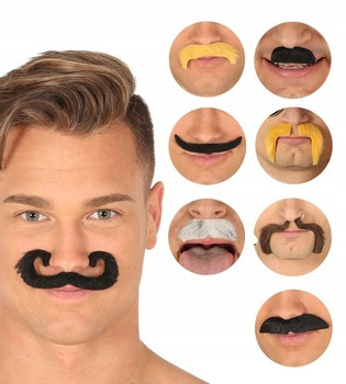 Zestaw wąsów do różnych charakteryzacji: elegant, łobuz, łajdak, Casanova, playboy, bandyta i inne według uznania. Wąsy samoprzylepne, mocowane są na taśmę dwustronną, wykonane z materiału z futerkiem.
