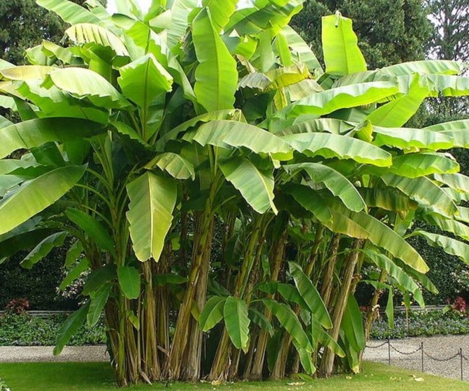 W cieplejszych stronach rośliny zakwitają interesującymi, brązowymi kwiatostanami z oryginalnymi podsadkami, po których pojawiają się małe bananki. Odpowiednimi dla banana wielkolistnymi sąsiadami są: katalpa, paulownia, duże trawy, palmy, yukki.