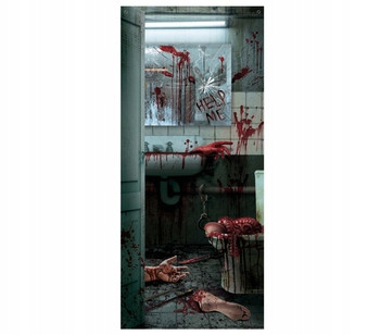 Zasłona z poliestru z nadrukiem otwartych drzwi do toalety w której miała miejsce krwawa rzeź. Wszędzie porozrzucane są odcięte części ciała, a na rozbitym lustrze widnieje krwawy napis HELP ME. Kurtyna posiada nitowane otwory o średnicy 1 cm, dla łatwiejszego zawieszenia. Idealna ozdoba na drzwi do ubikacji, a nawet przy prysznicu na Halloween i straszne przyjęcia.