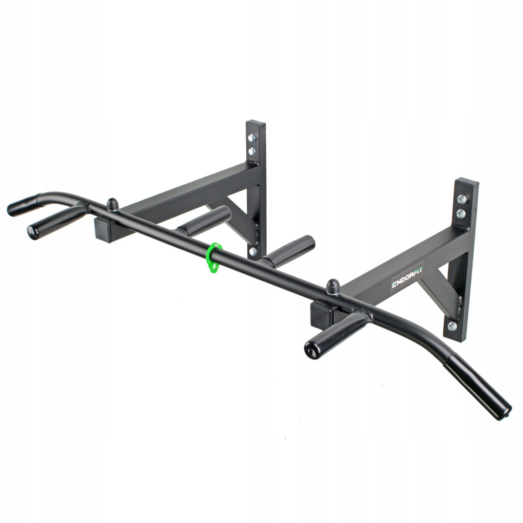 Drążek do ćwiczeń Endorfit EH-D101 umożliwiający podciąganie w nachwycie szeroko, podciąganie w podchwycie szeroko i wąsko, szrugsy w zwisie oraz podciąganie na dodatkowych rączkach, które pozwalają stosować chwyty niemożliwe do wykonania na drążku prostym.