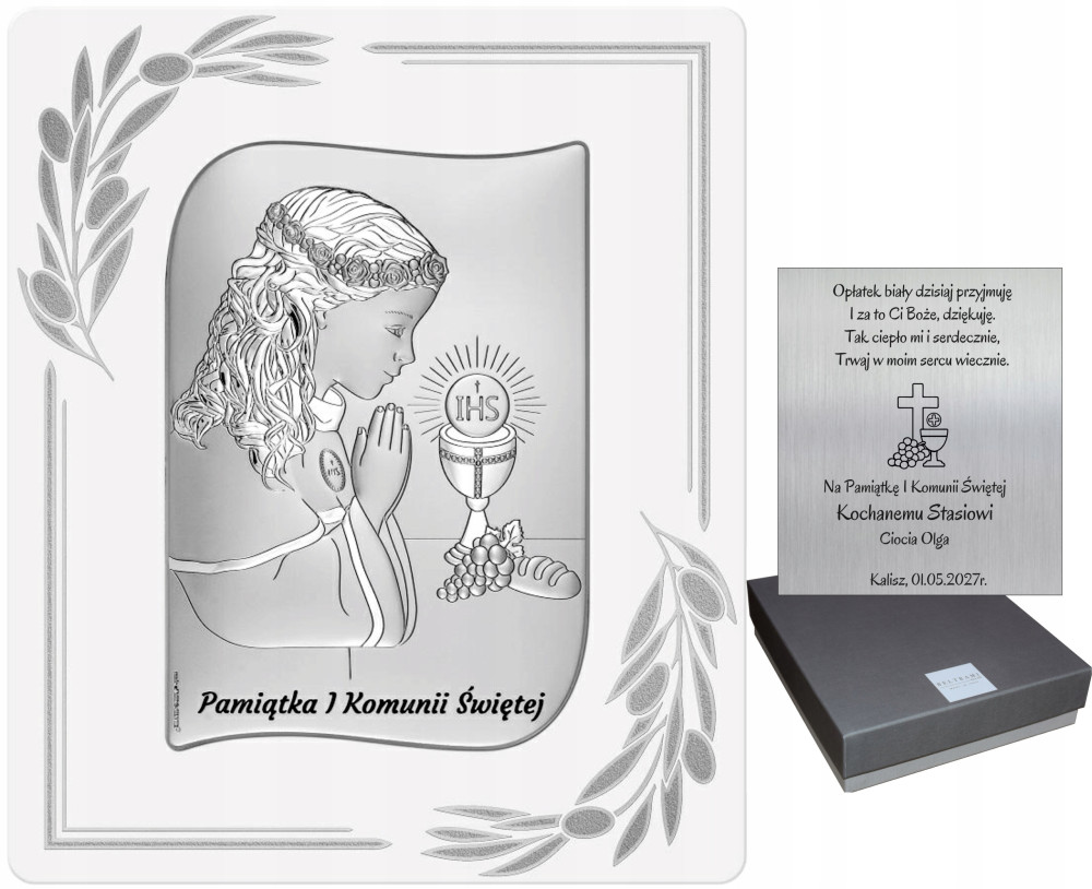 Srebrny obrazek przedstawiający wizerunek modlącą się Dziewczynkę oraz kielich z Hostią. Atmosfera podniosłego Dnia przyjęcia sakramentu Pierwszej Komunii Świętej została w pełni oddana na subtelnym obrazku.
