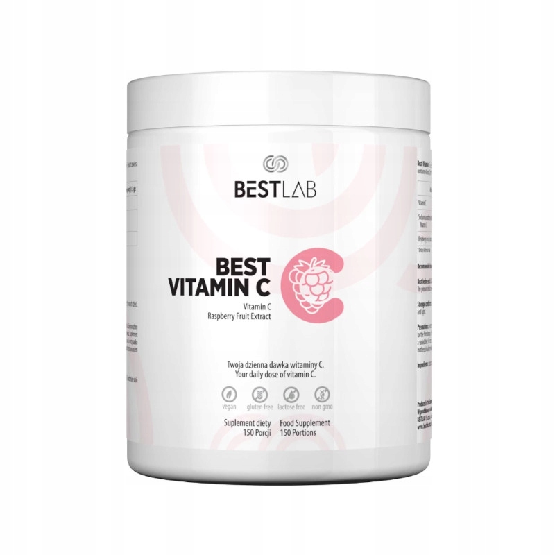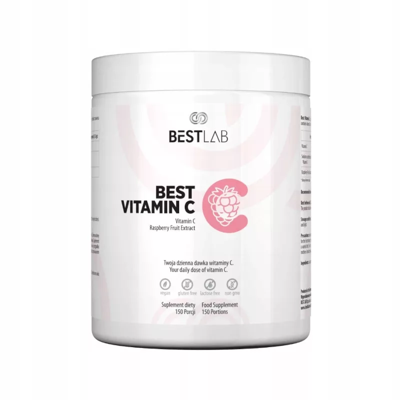 Suplement diety Best Vitamin C 195 g BEST LAB - zawiera witaminę C w postaci kwasu L-askorbinowego oraz askorbinianu sodu, z dodatkiem ekstraktu z malin.