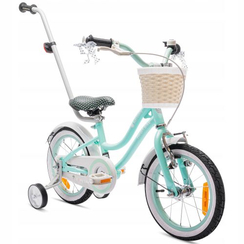 Bardzo ładnie wykonana kierownica w kolorze ramy. Posiada różowe rączki ze wstążeczkami, które powiewają i przyciągają uwagę w trakcie jazdy. Na kierownicy zawieszony jest biały pleciony koszyk aby niczego nie zabrakło w trakcie rowerowej wyprawy. Aby dziecko mogło dać znać, że nadjeżdża rowerek wyposażony został w dzwonek.