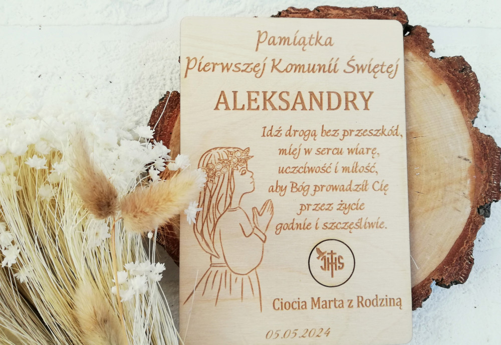 Drewniana kartka posiada elegancki grawer w postaci życzeń i grafiki, nawiązującej do uroczystości Komunii.