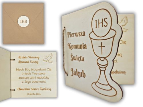 Drewniana kartka to oryginalna Pamiątka I Komunii Świętej.