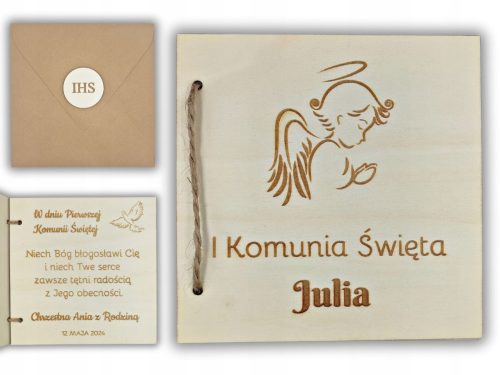 Drewniana kartka to oryginalna Pamiątka I Komunii Świętej.